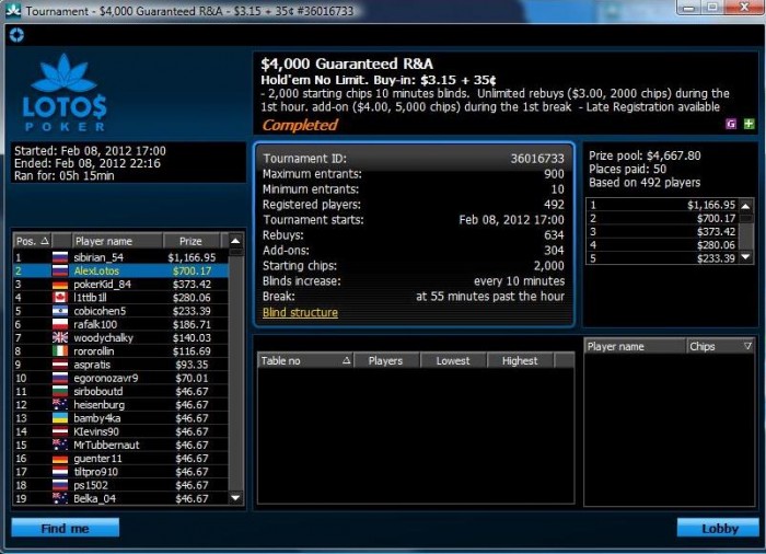 В ХА вышел с 800к против 3кк. Выставились 77<AQo Но я рад и второму месту, т.к. оно равно практически 2-м третьим и борьба шла в основном за него... Чиплидер имел половину всех фишек на финалке.