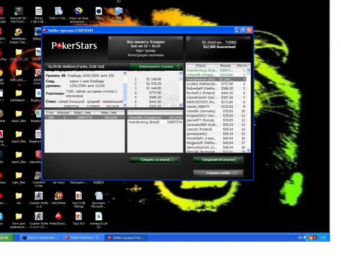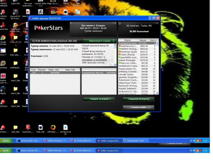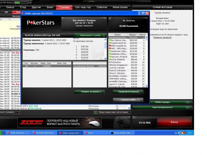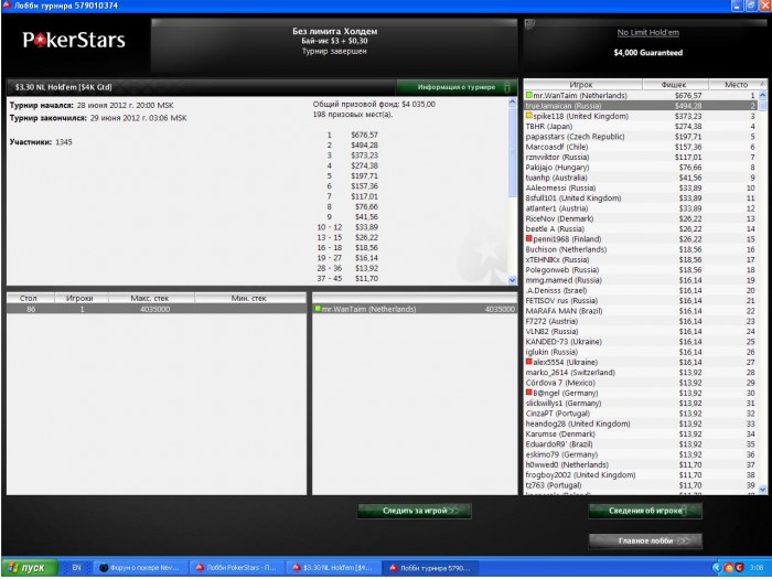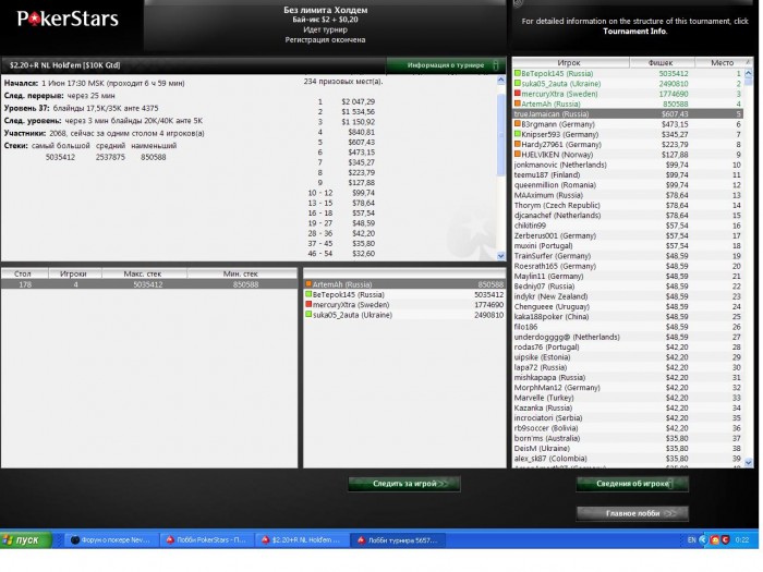 Удачи!! ;) вчера тоже играл в шторм, с Антохой) когда попали в 1000, увидели тебя в лобби) стек был около 250 000, у нас около 140 000, но не встретились) мы аут на до твоего вылета) писали в чате)