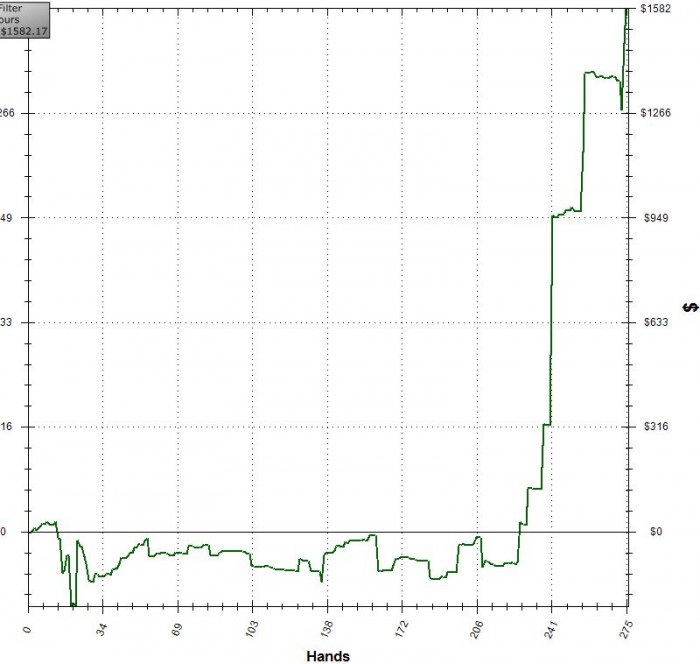 Заглянул фиш на 1/2 50бб со стеком 40 баксов. Через пол часа его стек составлал $989 правда вовремя не слинял, но таки половину вернул. Сорвался с крючка, собака в последней раздаче: