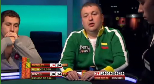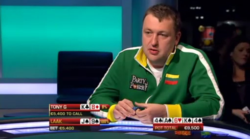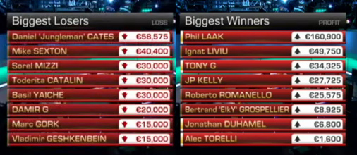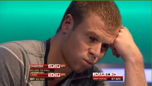 Префлоп АИ, у Мозли, у Лаака, но Лаак говорит, что покажет руку, только если выиграет пот. Флоп без попаданий, шестерка на терне, Лаак стоунфэйсит, ривер бланк, и Фил, не посмотрев карты, фолдит и своими руками отдает выигранный банк в 63 тысячи евро.
