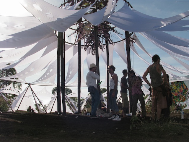 Приехали как раз вовремя, народ собирался на главном танцполе для проведения церемонии открытия. Очень много людей приняло участие в организации феста, в том числе все декорации делались в ручную. В центре танцпола было 12 лотосов из бамбука, в каждый из которых был вставлен специально подобранный по свойствам камень , под которыми закопали большой кристалл. Вокруг многие поставили лавочки, где можно было приобрести hand-made вещи- начиная от одежды заканчивая украшениями из серебра итд. Каждый продавец- дизайнер и мастер, делающий действительно необычные вещи, в которые вкладывается душа.