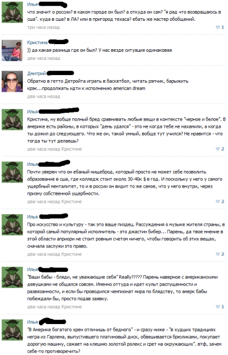 Вы все нищие и жалуетесь на богатых и ненавидете их, но все же и мечтаете ими стать. Причем, богатые - это та еще песня. В Америке богатого хрен отличишь от бедного. Человеку не в западло носить кроссовки за 30 баксов, здесь же каждый разбогатевший в худших традициях негра из Гарлема, выпустившего платиновый диск, обвешивается брюликами, покупает дорогую машину, сажает на клешню золотой ролекс и срет на окружающих. В США у меня было много богатых друзей, про которых я знал, что если не они сами, то их родители получили свое бабло честно. У кого были стартапы, кто начал свое дело. У вас же если есть хотя бы миллион баксов, то обязательно чел вор, взяточник, или редчайшая сука, с которой впадлу за руку здороваться. Ни одного богатого не видел, который не выставлял бы деньги напоказ.