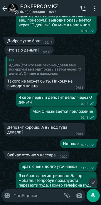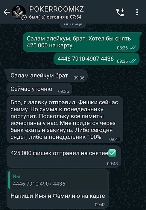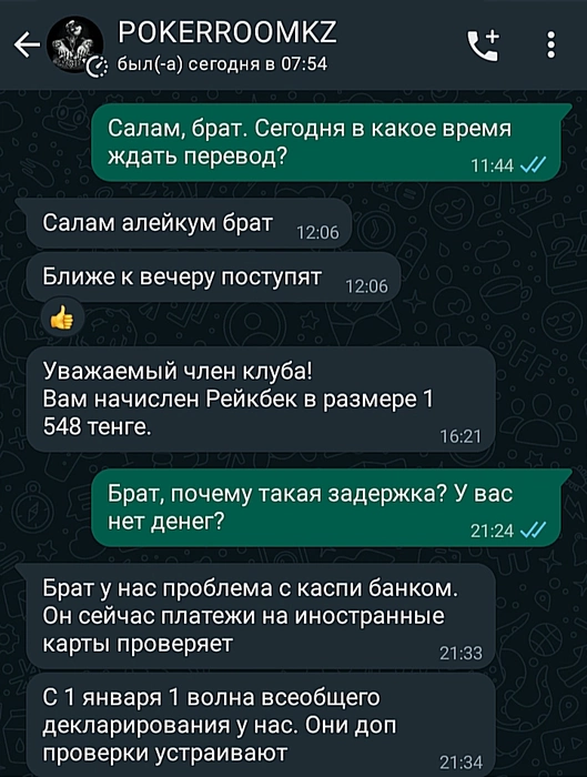 Здравствуйте. Хотел бы поделиться с тем, как казахстанский покерный рум POKERROOMKZ в приложении ClubGG, задерживают вывод денег. Я запросил снятие в позапрошлую пятницу и уже прошло более 10 дней. Первый раз когда я запросил, они написали что "все лимиты исчерпаны", и поэтому просили подождать до понедельника. В понедельник выясняется что есть проблема с переводом в иностранный банк из за необходимости декларирования. Но уточнив у Каспи банка я выяснил что при переводе на иностранный банк, декларация не требуется ( все скриншоты переписок прилагаю к сообщению) о чем и сообщил администратору рума. Он отреагировал агрессивно, и говорит давай не будем об одном и том же, хотя эту информацию Я ему сообщил впервые. В общем, он просил ожидать. Со своей стороны я предложил ему ещё 2 электронных кошелька куда можно сделать перевод мне с Каспи, на что он сказал что уточнит у кассира, но ответа я так и не получил. Дальнейшие мои запросы с уточнением сроков решения данного вопроса, он просто перестал читать. В итоге я вынужден это все озвучивать здесь, чтобы вы знали, что у них есть проблемы с выводом денег. Поскольку сумма немалая, то возможно они решили эти деньги оставить себе, придумав эту сказку с декларацией. Ведь сотрудник банка Каспи сказал что деклараций при переводе не требуется. И на мой запрос у администратора рума скинуть мне скриншот сообщения об ошибке перевода денег, он опять таки не скинул. На предоставление ему 2 других способа перевода, он не ответил. По срокам решения тоже. Налицо нежелание переводить запрашиваемые мной деньги. Если это сообщение как то их не вразумит, то я буду обращаться в надзорные органы Казахстана. Большая просьба поделиться этим сообщением с теми кто возможно играет в их покер руме, чтобы они знали, что когда игрок выходит в плюс, они могут не сделать перевод, придумав любое оправдание. Будьте осторожны с этим покер румом POKERROOMKZ.