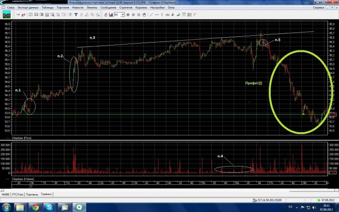 patrik354 @ 7.9.2012 П.1 Итак, перед открытием я стоял шорт по сбербанку. Сработал стоплосс и я зафиксил убытки на 94.