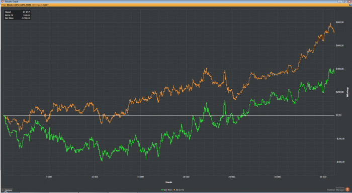 Колебания ЕВ линии это кулера типа сет в сет и короли в тузы. При стеке 40бб и эквити 20% 1 кулер это всего -32 ев бб/100. И по моим прикидкам за 2000-3000 рук в 95% случаев дисперсия по ЕВ не привысит 140бб. То есть проиграть по ЕВ больше чем мсс баин (при ожидании +100бб или 4-5бб/100) это в подавляющем большинстве случаев результат ошибок и некачественной игры.