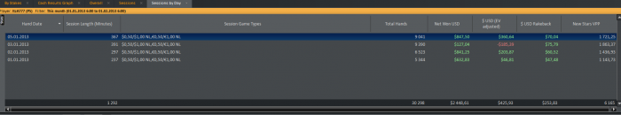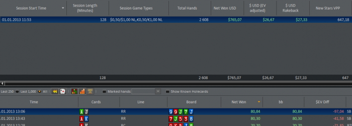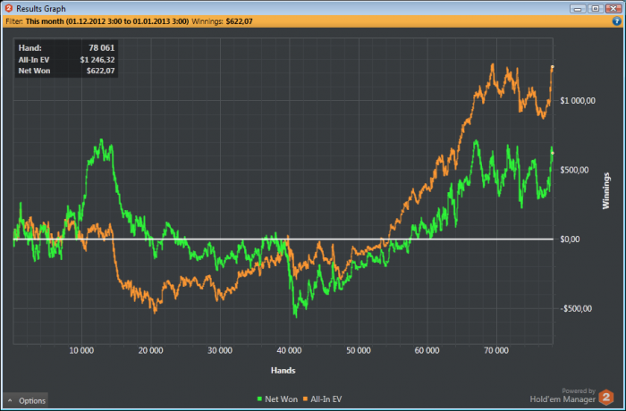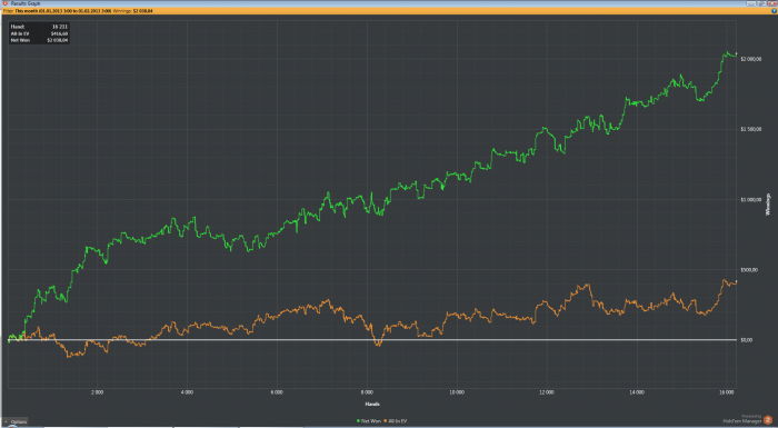 Хорошее начало года! Респект! Надо уметь ценить то, что есть. В покере ведь невозможно ставить финансовые цели, вернее, конечно можно, но толку от этого не более, чем от гадания на кофейной гущи. Уверен, что ты и сам это понимаешь, и мне очень нравится твоя методика по определению сколько и когда играть часов, рук, на каком лимите и при каком текущем банкролле. Это то, что мы сами можем контролировать, и это то, что мы обязаны контролировать. Плюс занятия спортом, здоровое питания и хороший сон. Это все не так просто, как кажется на первый взгляд, но это возможно. А вот предсказать финансовый результат в покере - нет, как бы нам этого не хотелось). Поэтому предлагаю тебе не зацикливаться на результатах отдельных сессий или дней. Это ведь совсем ничего не означает. Хорошо, что сейчас неплохой апстрик и тебе их приятно рассматривать, а что будет, если немного накроет и ты продолжишь так же акцентировать внимание на каждый минусовой день? Скорее всего будет много негатива, который может помешать настрою на более высокие цели. Хотя, конечно, могу и ошибаться. Удачи!)