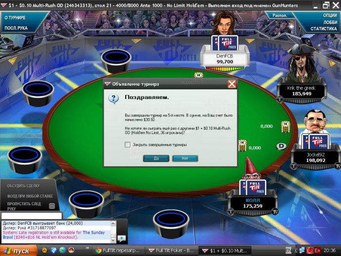 Full Tilt Poker $250 Guarantee No Limit Hold'em Tournament - t1500/t3000 Blinds + t400 - 9 players -