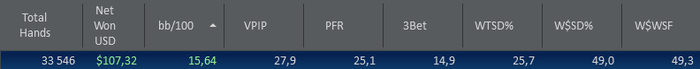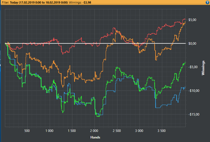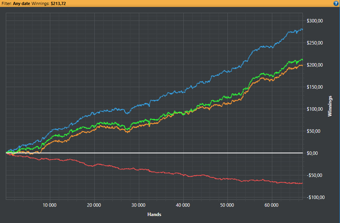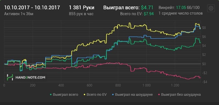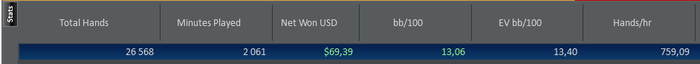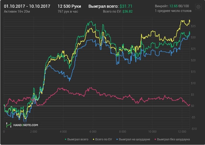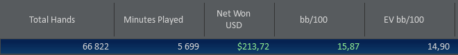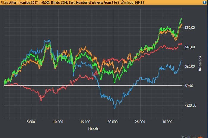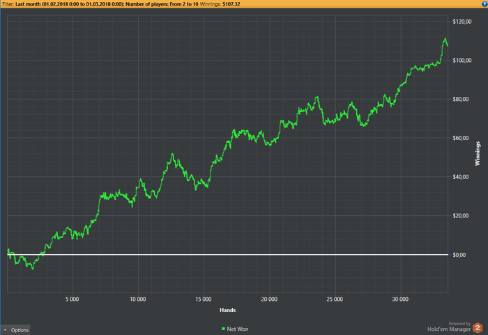 Месяц завершился. Всего 95 часов игры, а надо бы раза в два больше, ну хотя бы часов 150. Но у меня не получается больше 700 рук в час на 4х зум столах. Хер знает, как у людей выходит по 1000 и даже по 1200 рук. Ну короче, свои 15бб\100 я отжал, правда и апнуло немного. Но это же сука нл2 и если не делать всякой не нужной херни, то реально вытаскивать и по 20бб. Но без херни же так скучно. Видимо действительно пора попробовать поиграть выше. Ну хотя бы нл5)))