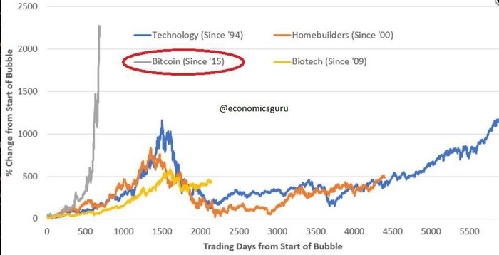 А теперь немного о биткойне. В этом вопросе есть, как оптимисты так и пессимисты. Я лично отношусь к битку, как к биржевому инструменту. А это значит, что на нем можно как заработать, так и потерять. И самое главное, что верояности этих исходов 50 на 50. Ну это конечно мое мнение. Я на бирже уже лет двадцать и всякого повидал. И надутые пузыри и громкие падения. Но приведу лишь две картинки. Как пищу для размышления.