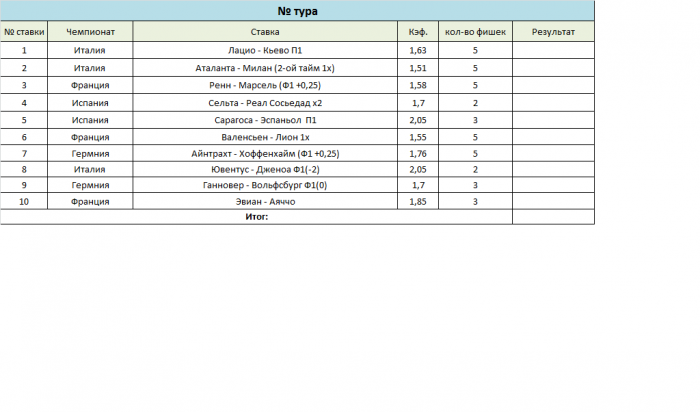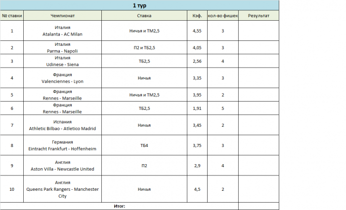 Думаю, что чуть позже будет сводная таблица. Лично у меня 5 проигрышей, 4 победы, 1 расход. Балланс 95,4%(-4.6% за тур). Следующий тур буду делать менее дисперсионным (хотя и не беру ничьи и прочее). А в этом подкачала Фиорентина - выигрывавшая по ходу матча, но умудрилась упстить даже ничью и вчера Сток - упустивший победу, ведя 2-0 дома. Как то так.