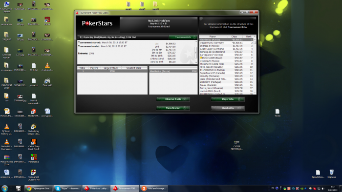 Ну вообще турнир прошел успешно, очень везло с оппами и особо подставных раздач не было, в 1/4 финале чудом отскочил по этому полуфинал провел на втором дыхании и русскому оппу не оставил ни шанса, сровнял с землей просто, очень ругался что мне заходит, хотя до шд ниразу не дошли почти