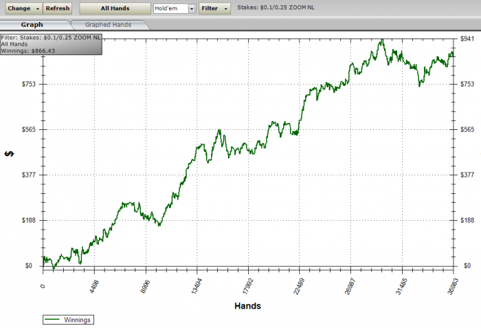 По профиту вроде пока особо не отстаю, но уже понял, что для достижения запланированного количества рук, необходимо увеличивать ежедневное рабочее время. Хотя цель не кол-во рук, а достижение 4к$, соответственно, если будет винрейт более запланированного, то и рук понадобится меньше. Хотя по правде сказать пока не уверен, что смогу иметь выше запланированного винрейта на нл25 на большой дистанции. Но именно над этим я и собираюсь потрудиться.