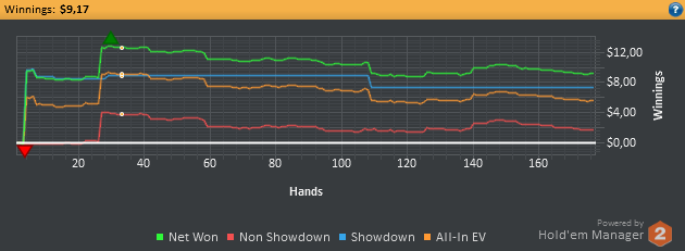 BB: $8.63 - VPIP: 22, PFR: 17, 3B: 6, AF: 9,0, Hands: 172