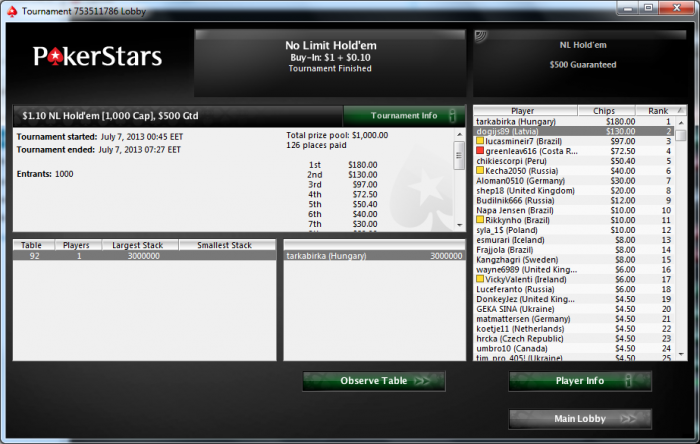Poker Stars $1.35+$0.15 No Limit Hold'em Tournament - t15/t30 Blinds - 10 players -