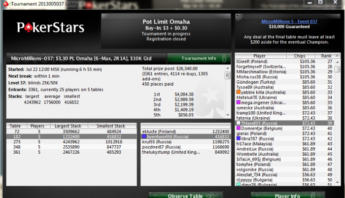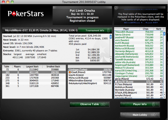 7/22/2013 MicroMillions-037: $3.30 PL Omaha [6-Max, 2R1A], $10K Gtd Omaha PL $3.00 + $0.30 $26,340.00 42 / 3361 $72.43 (12.30$)