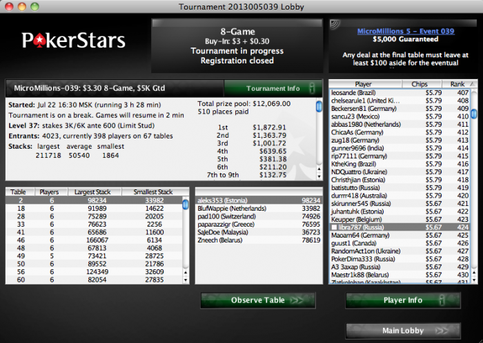 Общий профит: -118.05$ 7/22/2013 MicroMillions-040: $5.50 NL Hold'em [6-Max, Turbo, Knockout], $40K Gtd Hold'em NL $5.10 + $0.40 $68,172.70 7554 / 16627 $0.00