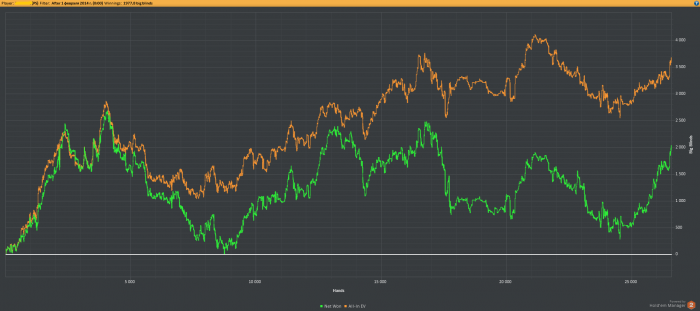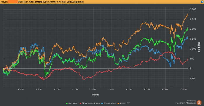 Наконец-то я начал разбираться с фильтрами, обнаружил огромную утечку денег: блеф на ривере, и вообще играю как говно, а тут еще и блеф на ривере. Зато красная выше 0.