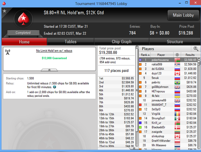 pokerhousen @ 19.2.2015 отобрался на юбилейный СМ сыграв 4 сата по 1.65р 3х турбо и за 375 фпп,и в итоге прошел в сате за фпп...так что буду тащить!!!!