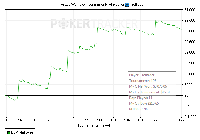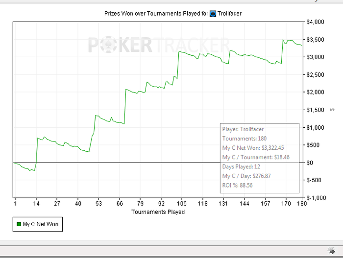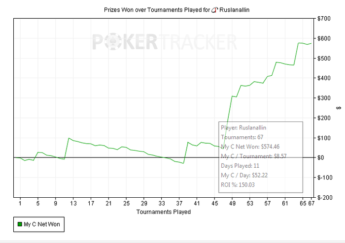 Как то странно Poker tracker считает турниры и профит, на титане показывает на 88 бачей больше. На 888 не считает некоторые турниры, вместо 18 за сегодня показывает только 15, но вроде профит считает правильно