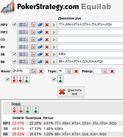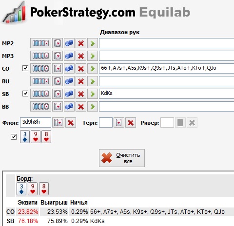 Hero (SB): $12.59 (251.8 bb)BB: $2.79 (55.8 bb)