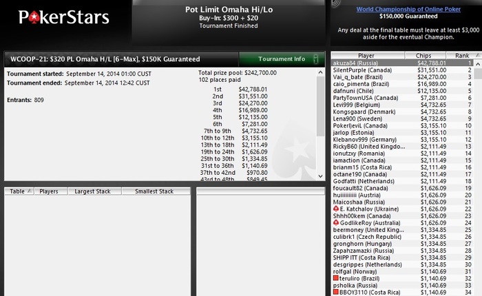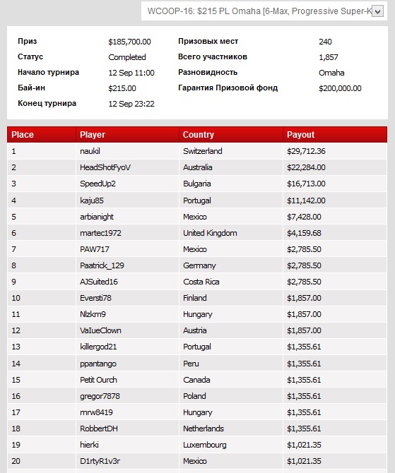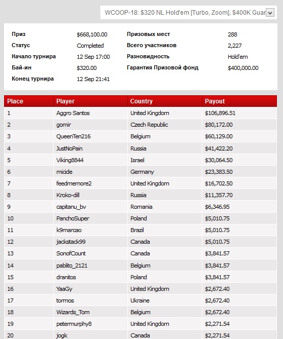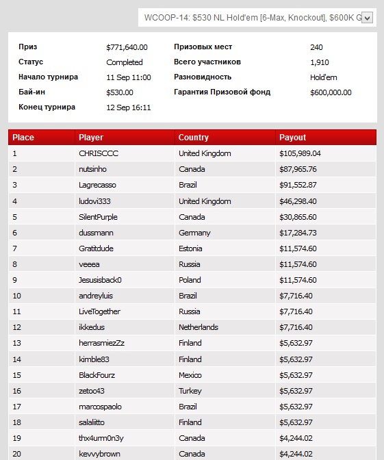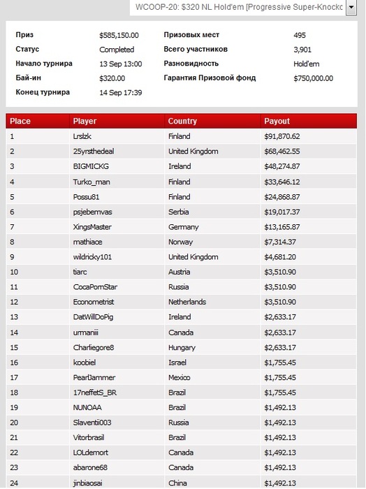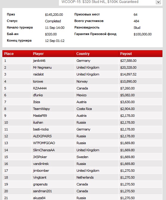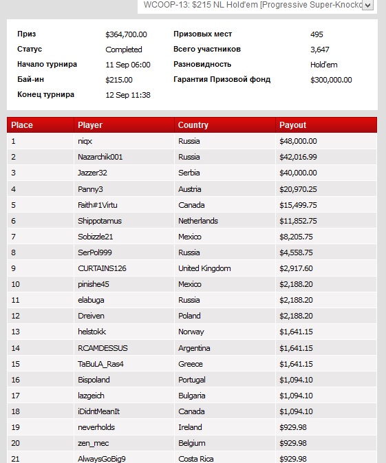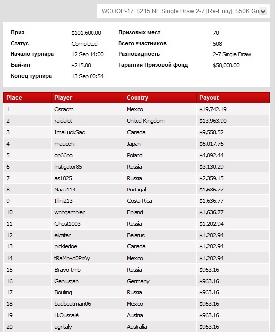 WCOOP-29: $320 FL Badugi, $50K Guaranteed, вероятно турнир еще идет, т.к. на сайте старсов резалтов нет, а с телефона я не могу зайти в его лобби (в выборе типа игры нет этой разновидности) :)