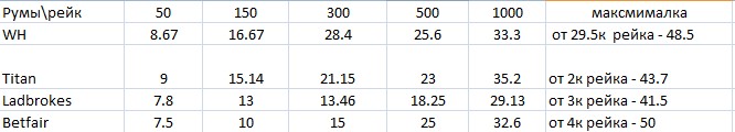 (Размер необходимого рейка в некоторых случаях должен быть немного больше указанного в таблице но это не более 5%. В Титан покер за игру в турнирах дают на 3 очка больше за каждый евро рейка, поэтому кешбек для игроков СНГ больше на 1-2%)