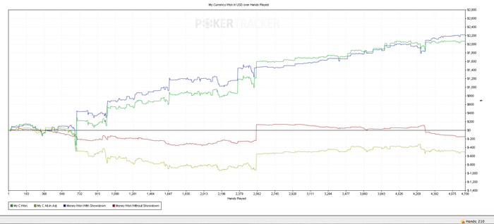 Да потому что эти кэшауты ничего пока не значат. И делаю я их часто для того, чтоб отбить вложения, пока идет карта и я не нарваться на тильт))) В конце месяца можно уже будет как-то оценить мою игру, я специально выкладываю график за все время, с начала ноября, чтоб и самому быть дисциплинированным, и вопросов не возникало лишних )))) Сегодня снова 210 рук ни о чём. Сейчас появились кой какие дела, но думаю позже продолжу катать.