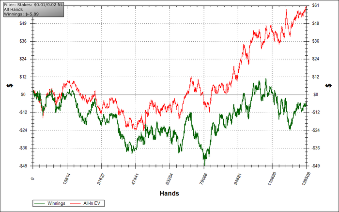Однако если вы попробуете пожаловаться на этот график, вы ничего не получите. Потому что евбб составляет всего лишь 2.41бб/100, а это очень низкий винрейт и колебания дисперсии при не в теории огромны, а значит никакой доказательной силы даже такой график на 100к+ рук иметь не будет.