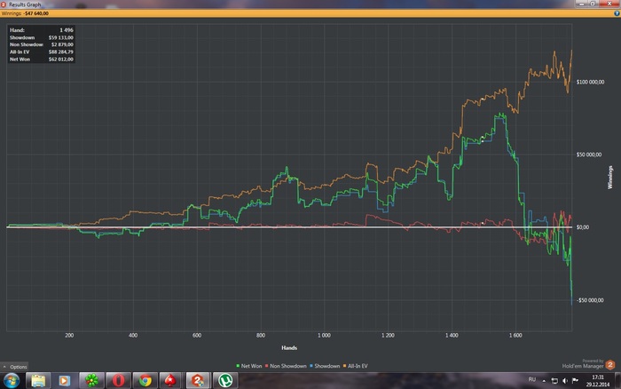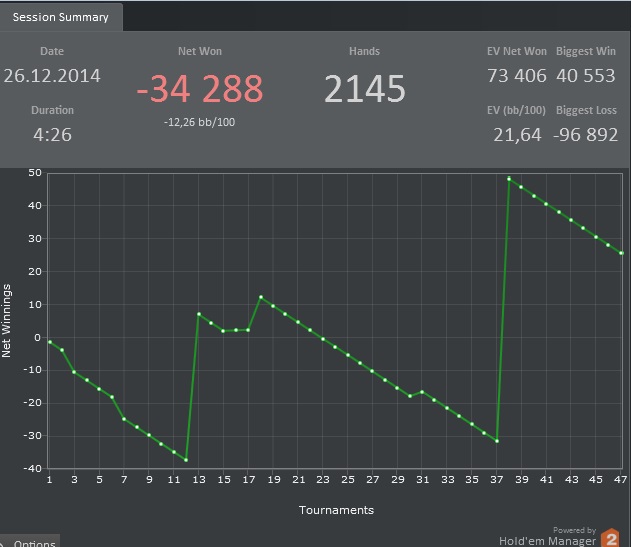 В общем хватит это терпеть. Зашёл с компа друга из другого города, откатал 1 сессию 33 турнира, на этом достаточно в этом году. Более полные резалты выложу сюда по приезду домой числа 31 думаю. Я не в тильте, всё нормально. Просто много переезжают...последнюю неделю, сильно много. А играть уже возможности совсем нет в связи с отъездом. По профиту опять летел и последний стол затащил топ6, в итоге -2$