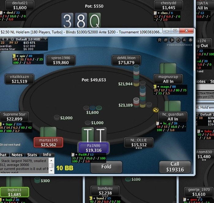 С руками JJ+ я думаю и AK+ (возможно AQ). Да в этом турике я занял топ1. Просто десятки конечно хорошо, но я думаю, что если вбить спектры их пуша-колла в калькулятор, то десятки будут неважнецки стоять против двоих. Если бы один из оппов был короткий, то я бы изи вколил. Плюс к тому же стек у нас имеет достаточно фолдэквити, так как по размеру является чуть ниже среднего и блайнды нас уже прошли, то есть варианты более плюсового выставления мы ещё найдём. Но собственно в следующей раздаче или через одну я утроился.