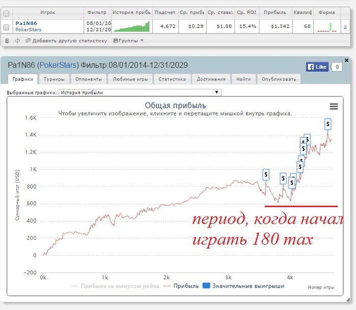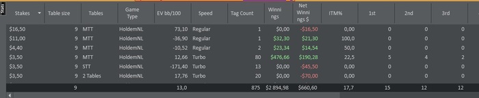 Сегодня проводил лайф сессию с тренером, особо некачественных действий вроде как выявлено не было. Сыграно 86 турниров, затрачено 8 часов. Делал вылазку на пару турниров 3,5$+R 180max, но чёт меня там встретили не радужно. Очень не привычно и много денег от БР отбирает 2 турнира сыграл и сразу в кассе -25$ Может по 1 шт. буду добавлять к дневной сессии иногда, так сказать привыкать к полю. Шло всё в большой минус, но опять чудесным образом всех раздавил чипак, за 6 раздач -5 человек и наступил ХА где меня тоже смял сразу (но когда раздают как богу - не попрёшь). В итоге день примерно +25$ правда ещё не вылетел их хота за 2.2 осталось 80 человек, но там копейки за итм баксов до 10 всё равно. Но если занесу (хотя с сегодняшним стриком это анрил) то отредактирую пост.