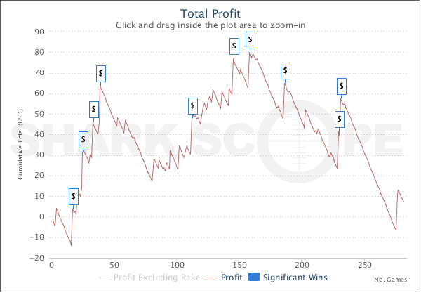 Вчера в обычных турнирах в глубокий ITM не проходил, но Sunday Storm порадовал. 537 место(+103$) Это значит что опять можно переходить на полторашки, которые так и не покорились мне с 1го раза:)) Сегодня поиграл мини-сессию на 12 турниров. AA<66 за чип-стек на финалке, A9s<J8s, AQo<T2s... - теперь я только улыбаюсь, когда меня так переезжают, это же турбины. Зато сам сегодня выиграл турнир 78o>AT. Надо привыкать Теперь буду играть только на качество. Максимум 12 столов. На данный момент графики такие: 1.5$ 45max turbo: Общий с начала марафона: