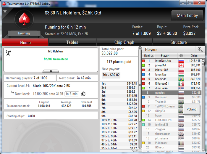 KirylKiryluk, Спасибо, очень приятно что меня кто то читает. Теперь буду чаще писать) Я просто на работу устроился + учеба, поэтому времени очень мало... Пока ничего не залито, марафон закончен не будет и точка Сегодня сыграю в Sunday Storm + еще парочку бигов. Также подключу все турниры до 1$, которые будут идти вечером) Из недавних "достижений": 23 место в биге за 4.4(+43$). Проиграл из за своей глупости: a) Сделал мин3бет в 5 бб на баттоне с AK против лузового оппа с CO. - Надо было делать 6bb б) Поставил cbet в 2/3 банка на флопе(3 T J). - Надо было просто чекнуть в ответ в) Не смог выкинуть в ответный пуш(20bb), зная что опп впереди и надеясь что выйдет Q. - Тут без комментариев, и так все понятно) У оппа оказался AT, мне ничего не доехало. -400к фишек. Потом 2 подряд проигранных коина и вылет из турнира. Видимо сильно сказалась усталость под утро после 7.5ч игры. Я таких глупых ошибок никогда не допускаю( P.s. Сегодня скорее всего уволюсь с работы, так как не готов пахать за 10к по 5ч в день без выходных(пусть даже и на удаленном доступе). Лучше сам пока поизучаю 1С до конца учебного года и на 4м курсе начну искать нормальную работу.