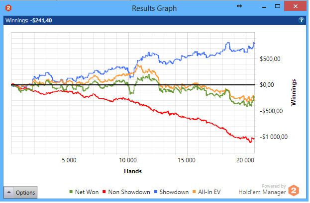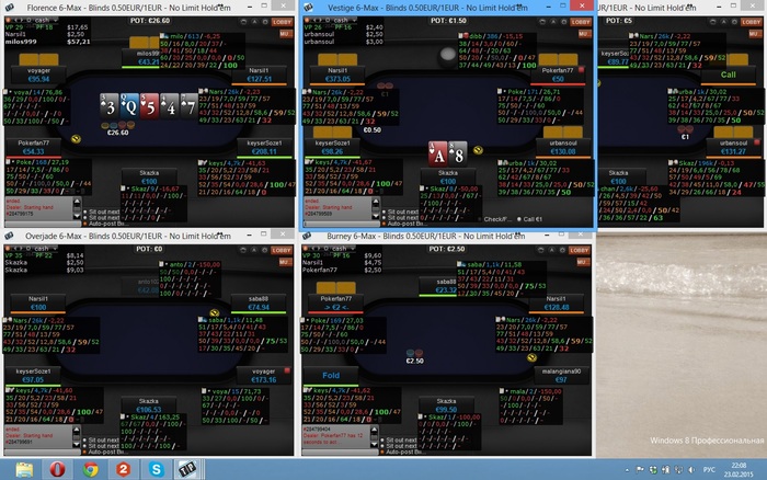 Месяц уныния и особого желания катать нет... отыграл 20 к. всего то ! 50-ка мне не даётся пока месяц был - 450. Вчера вечером заставил себя покатать , открыл рум и стандартная картина - одни реги , видимо привлекательная бонусная система слишком насытила рум желающими поживиться. Покляцал мышкой и наткнулся на столы с фишами , но это было NL 100 и тут лудоман во мне сказал вперёд , открыл 5 столов
