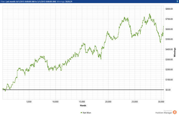 Ухххх, давно я не писал, это не серьезно как то и в целом вредит моему развитию. Как обстояли дела в апреле ? 1. По итогам наскреб на троечку и то только потому что катал в осмысленный покер бОльшую часть времени 2. Первая половина месяца прошла хорошо, играл в свою A-игру не без спорных моментов - один экстра тильтовый день, перебор с выходными. Вторая половина стала своеобразным лудоманским эпилогом - насмотревшись Альтшуллера (хорош черт!), залип реально на пло25 зум (в левом руме) - апнуло меня нормально под 20Bi и так же накрыло в тильте. Ребята даже против моих знаний комбинаций великой 4-хкарточной творили откровенную чушь и мне на секунду показалось, что я нашел грааль, оказалось это был лишь ГодМоуд и ест-нно я поплатился(((. По результатам в итоге вышло что то около +3Bi (сложно сказать точно из-за отсутствия OmahaManager) и такую же сумму примерно саданул здесь в нл. В итоге остаток месяца на нл на старзах прошел вообще смазанно Что могу сказать: - играл не свою дисциплину, результат очевиден. Начинать что то новое нужно согласуясь со своими планами и четко поставленными целями, наскоками вряд ли что хорошее выйдет. - были потрачены время и нервы. Откровенно жаль израсходованных ресурсов Признаю себя виновным, другой вопрос до конца ли я готов сделать выводы из вышеизложенного. Раз пишу здесь о наболевшем, надеюсь что в моем сознании происходит работа над ошибками 3. По турнирам вообще никаких успехов 4. Вышло в целом что-то около 40к рук всей игры. Результаты совпадают с графиком для 30к. 5. Касательно A) цели: набить и закрепиться на нл50 в течение 1.5-2х месяцев - медленно движусь и конец мая критичная отметка для ее достижения. Так что, есть что корректировать и над чем работать.
