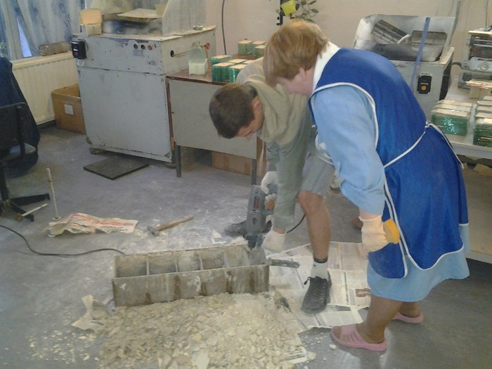 Несколько фото с работы: Тут я вычищаю хрень, которая остается после обточки стекл. Она похожа на очень плотный мел. Если долго не чистить, но она закаменевает . Как видно, я ее долго не чистил. Приходилось выбивать отбойником =)