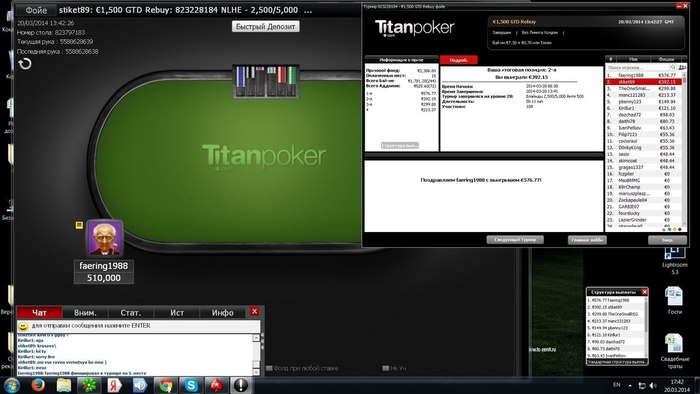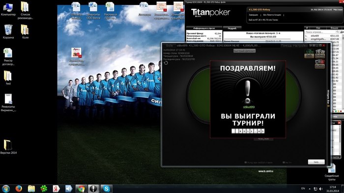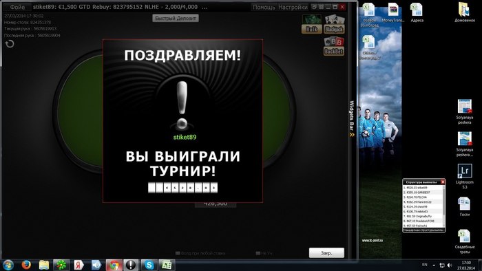 Я начал посвящать больше времени работе , ну и играть в покер. На работе быстро удалось найти несколько крупных клиентов, который помогли увеличить зарплату. В покер дела шли так себе, но 28 февраля 2014 года случился мой самый большой занос. Это был ничем не примечательный турнир. Как обычно, у меня было открыто около 5-6 игровых столов. Я делал какие то графики по работе, отчет за февраль , т.к. был конец месяца и в какой то момент понял, что у меня остался всего 1 стол, где был ТОП 100 турнира. Стек у меня был неплохой, поэтом, решил сосредоточиться на игре. В тот момент я состоял в конфе, где проанонсировал свой небольшой дипран. Несколько человек начали меня поддерживать. Я быстро вышел на финальный стол, где отыграл без ошибок .Состав был слабый , естественно. Все таки, турнир за 2$. Оставшись 1 на 1 соперник не захотел делить при перевесе 3 к 1 в его пользу, поэтому, пришлось его наказать. Эмоции от победы я никогда не забуду. Конечно , это не огромная сумма, но когда ты со 100 рублей выигрываешь 100 000 рублей - всегда очень приятно.