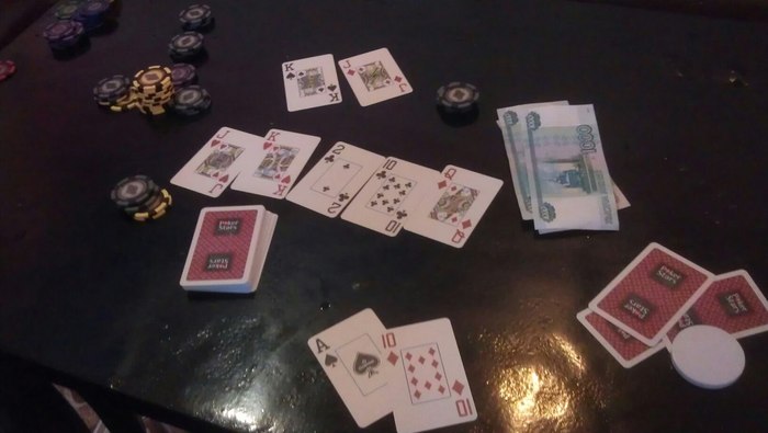 В другой компании, где люди так сильно не пили, мы играли турниры по 500-1000. Естественно, ребайники. Был один приятель, который постоянно ребаился на первых 5 уровнях. Бывало играли в кеш по номиналу. Блайнды 5-5. Банки доходили до каких то нереальных для этого лимита сумм. Однажды, в турнире по 100 рублей мы разыграли банк около 8000. Дело было под утро и все уже были в веселом состоянии. Схлестнулись флеш на фул хаус, который доехал ривером. Наверное, это была самый крупный банк, который мы разыгрывали.
