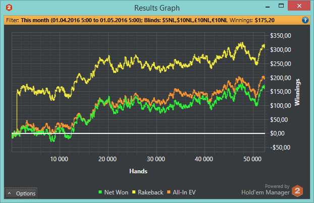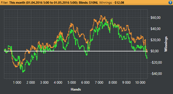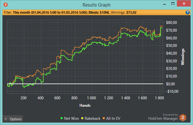 отыграл 96 часов, что вроде бы и больше чем раньше было, но все равно рук получилось достаточно мало. всё потому что я постоянно экспериментировал с количеством столов. Думал что для меня лучше все таки 6, потом вообще 4 попробовал, в итоге понял что абсолютно нет никакой разницы и можно спокойно катать 9 столов. с РБ по ХМу вышло 322$ 175$ по факту и 4бб\100 по ЕВ. жаль что с майнингом какая то лажа, и я убедился уже точно, что он добавляет какие то руки каждый день после установки и отнимает определенное количество $. думаю около 30-40$ было потеряно. ну ниче, все равно результат так себе.