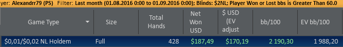 Torchidze @ 1.9.2016 Alexandrr79,у меня за июль август доход от покера составил баксов 150,но больше из-за того что я бухал,не играл и начали нервы сдавать.А потом вообще кеш аутнул все и не раскрутился,теперь на завод!:)))