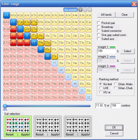Другое дело конечно, что ты можешь использовать чарты например для стека 0-5бб, 6-10бб, 11-20бб, 21-30бб - если это ты называл "костяком". И как бы их получится в 6 раз меньше. С другой стороны, когда ты пушишь К9о в стеке 6бб и в стеке 10бб это настолько разные ситуации, что винрейт может просесть на 5 бб/100. А это огромные потери. То есть, чем меньше ошибок совершаешь, тем выше винрейт.
