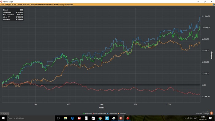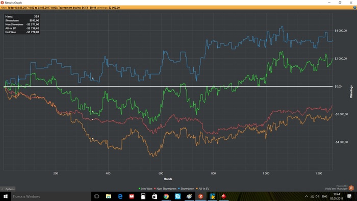 Признаюсь. Я не знаю как играть 7 лимит. У меня снова минус по деньгам и дикий минус по EV. Ни какие блефы пока не проходят, самому блефы вскрывать не получается. Даже не знаю, в общем совершенно игра не получается, по пост флопу меня просто делают как девочку.