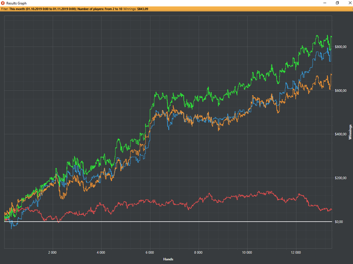 Начав писать месячный отчет, начну с того что с апреля-мая у меня последний день месяца каждый раз был залив от 5 и более БИ. Думал что сегодня это исправлю, но сев катать к обеду, в первые 100 раздач, залил 3 БИ и думал п**дец приехали, опять-снова, во вторую сотню рук отбился до -10$ и подумал, ну нахер эту катку в последний день месяца и закрыл столы + опять залил БР на кингах до 10$) не бью там даже нл10))