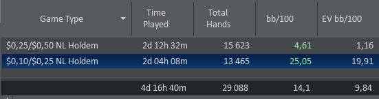 Когда начал БР таять от залива на полтосе, начал миксовать с нл25+ кэшауты меня полностью выбели из полтоса, так что последнюю часть месяца я катал только нл25, довольно не плохо: