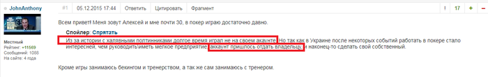 В 2016 году я выиграл ряд дорогих мтт, и с тех пор являюсь инвестором бекингового фонда по мтт, с недавнего времени и по кешу. Арбитражей никогда не имел. В 2015 году участвовал в войне рейтингов за необоснованные минуса моему другу.