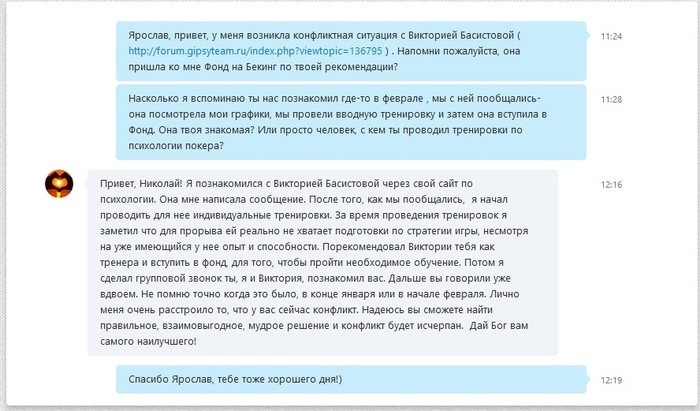 Это скрин переписки покерного психолога Ярослава Мунбин и Николая