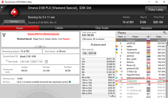 Но, как говорится: "Нет худа без добра!") Сегодня со мной произошла херня №2 - я как всегда в воскресенье хотел полудить, жму зарегиться в Sunday storm за $11 и, о чудо - миссклик, я в турнире за $109 по Омахе - пришлось взять себя в руки и катать, благо, Омаху в свое время и в оффе и в онлайне добро долбил, в итоге: