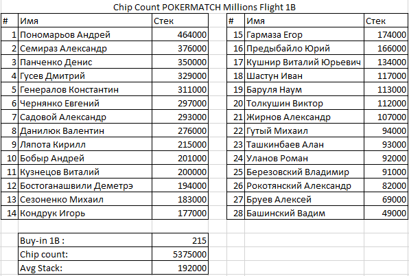 Завершилась поздняя регистрация во флайт 1B PokerMatch. В нем было сделано 215 входов. Борьбу продолжают 82 спортсмена. Им предстоит сыграть еще 6 уровней.