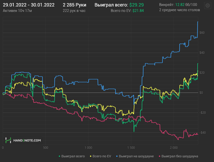 Ну в общем сегодня как то так. Смешанные чувства от сессии. Вроде и играл хорошо, но сдавали конечно грязь. В целом большинство проигрышей это из серии ААvsKK, QQvsKK, KKvsAA, сеты в стриты, сет в сет и подобное. Бывает, случается, идем дальше. В целом нл10 идет нормально. +6evbb/100 пока идем