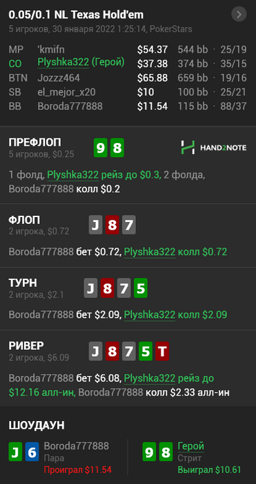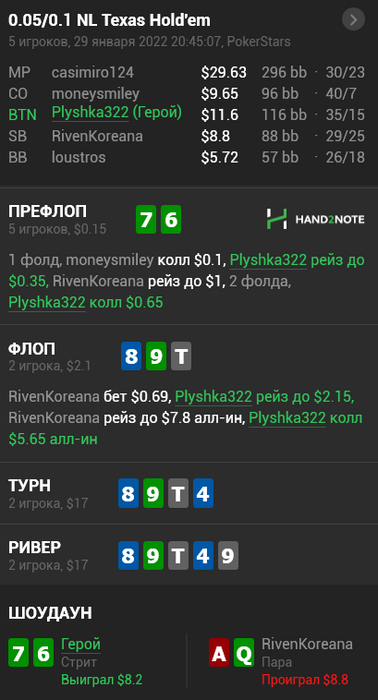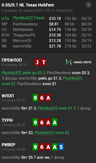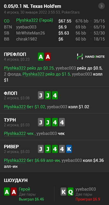 4. Ну тут против чела 44/0 все норм вроде, хотя рассматриваю, что в целом можно даже его рейз колить по флопу и по терну уже добирать: